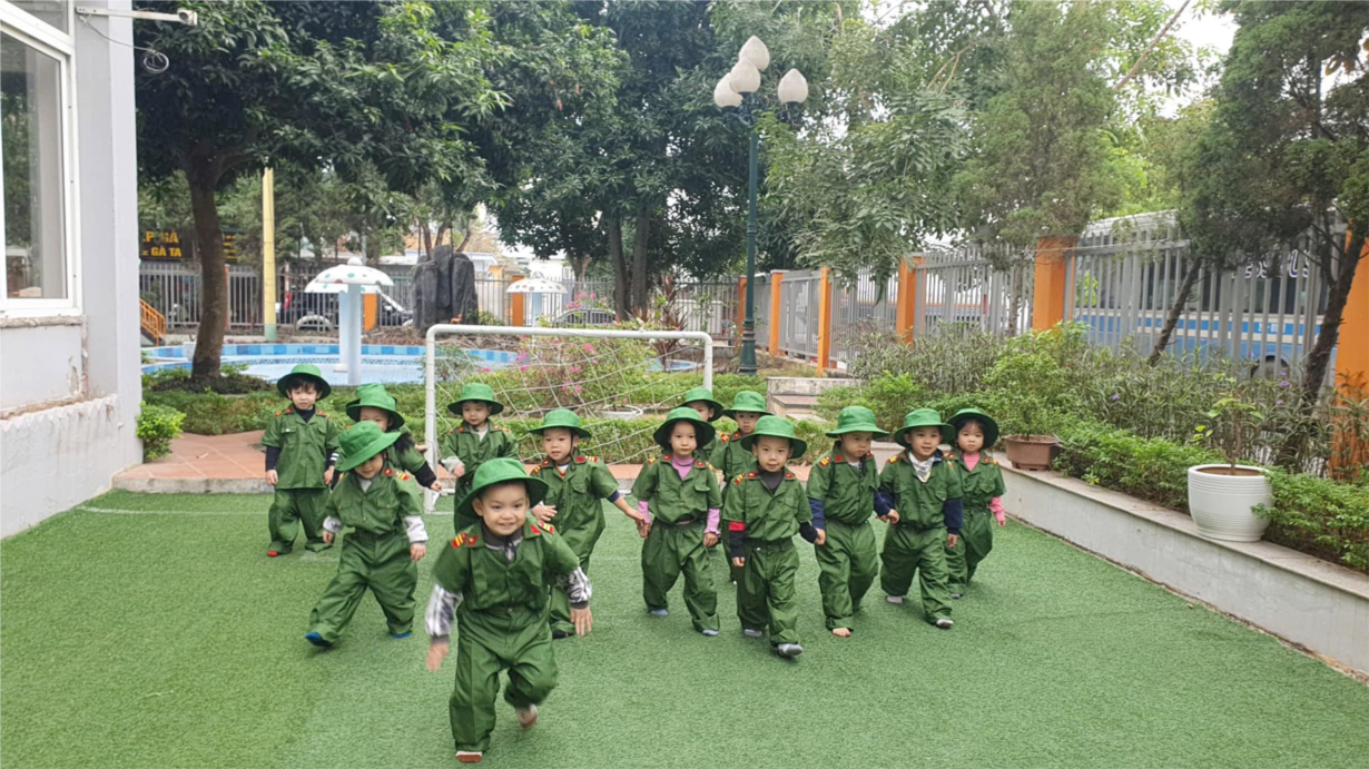 Hoạt động trải nghiệm của các bạn nhỏ MGNhỡ B3 khoác trên mình bộ trang phục chú bộ đội !