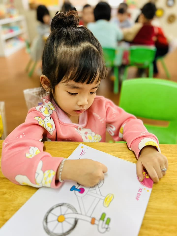 Giờ học tạo hình : Tô màu chiếc xe đạp của các bé lớp MGB C2