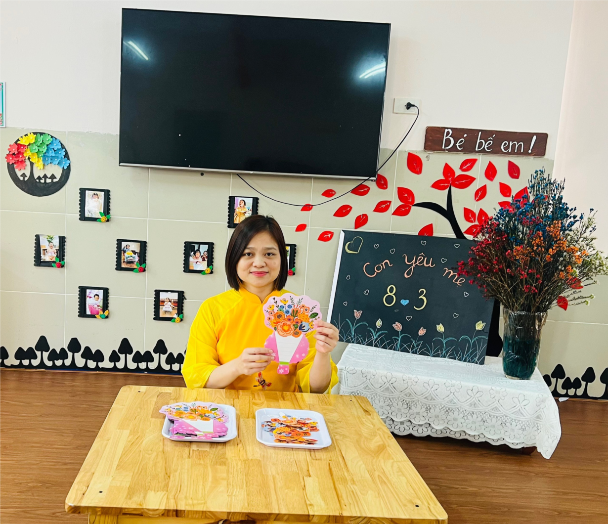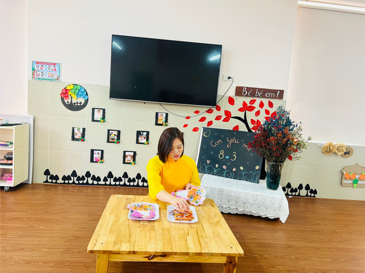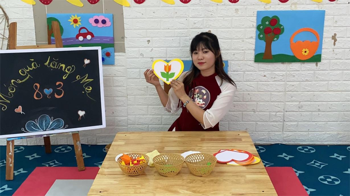 Cô và các bé lớp NT D3 cùng làm thiệp tặng bà, mẹ nhân ngày 8/3