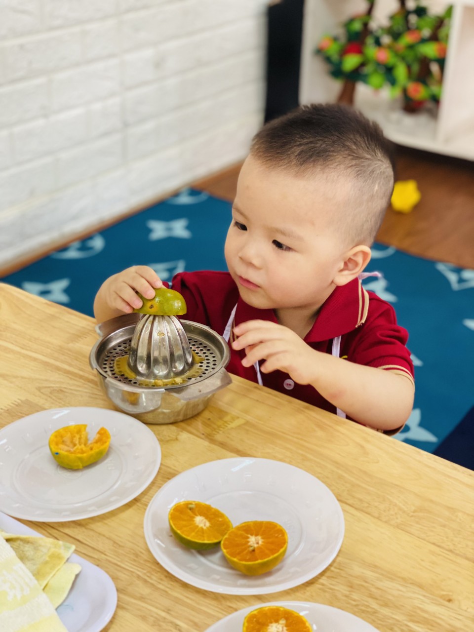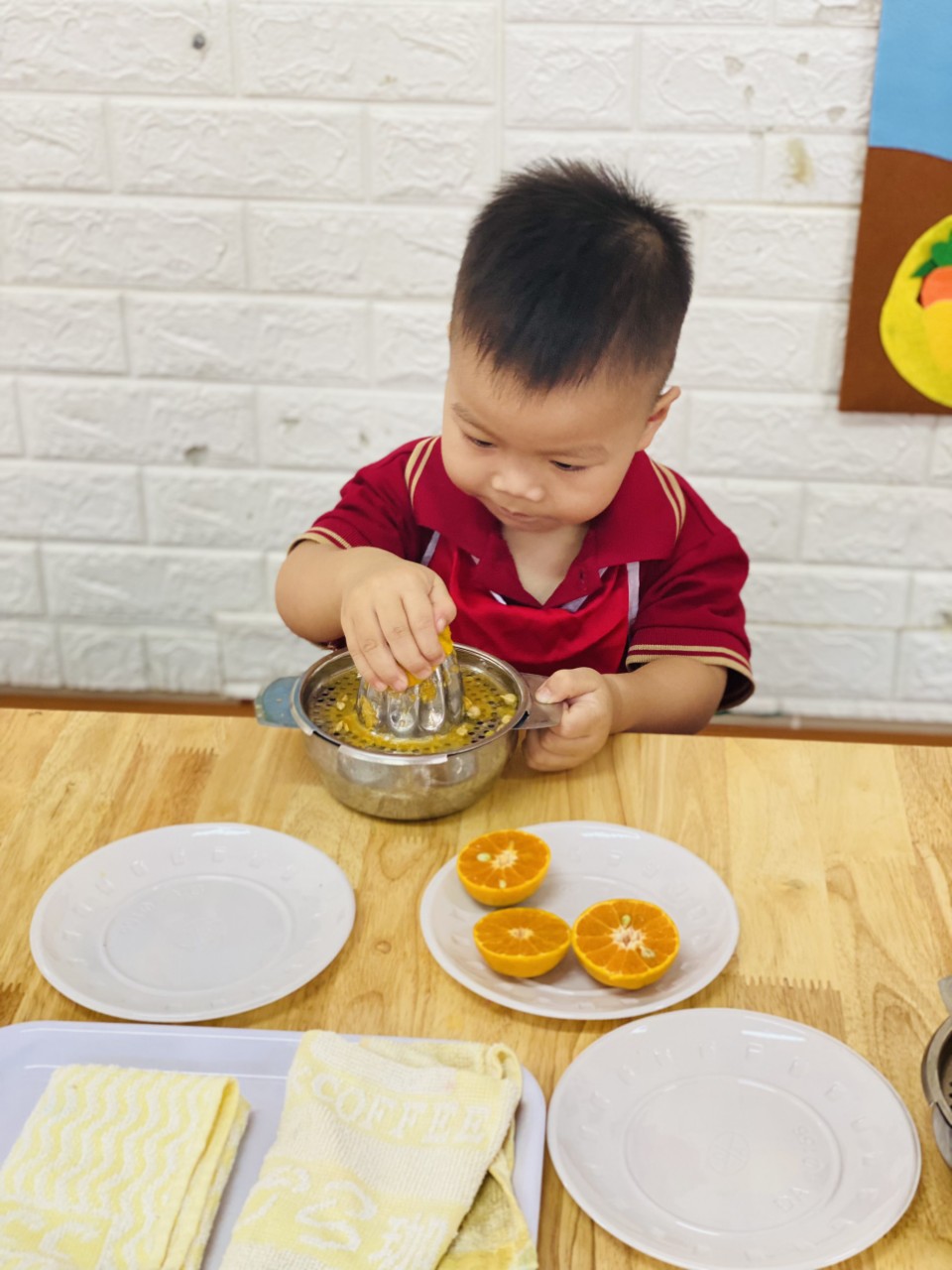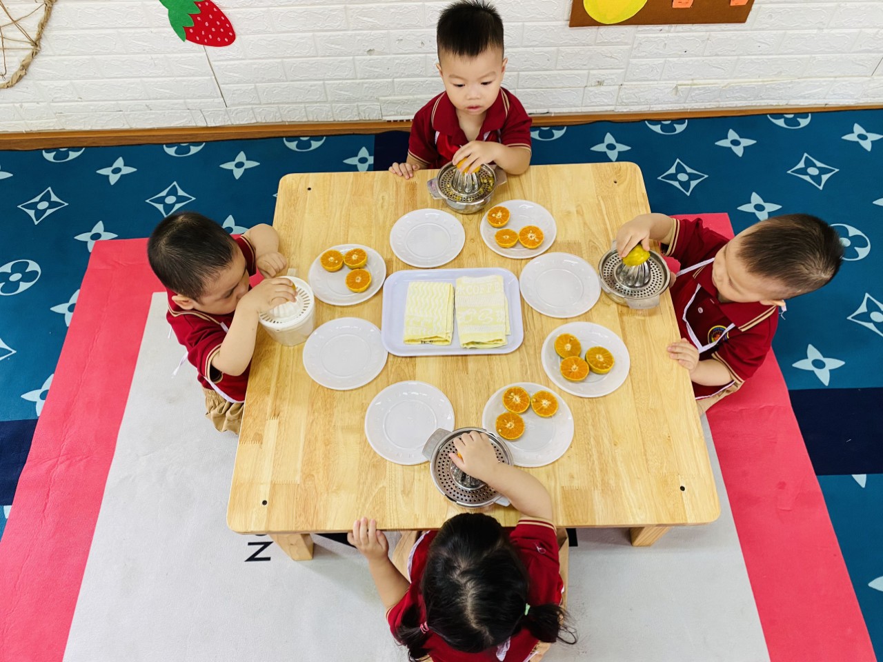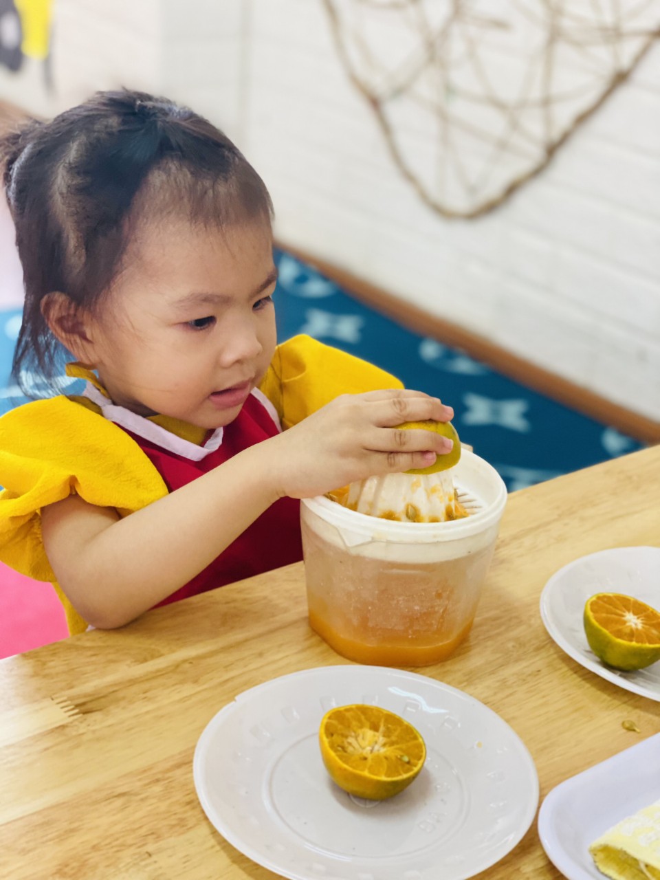 ✨Các bé được cô giáo hướng dẫn cụ thể từng kỹ năng cầm, xoay để vắt cam sao cho ra hết nước trong miếng cam và cùng thưởng thức cốc nước cam thơm ngon bổ dưỡng.