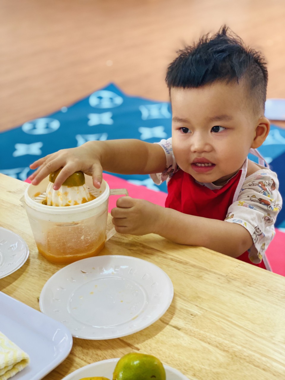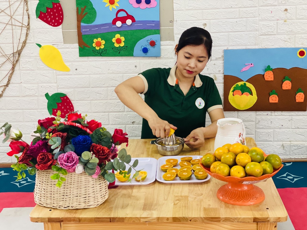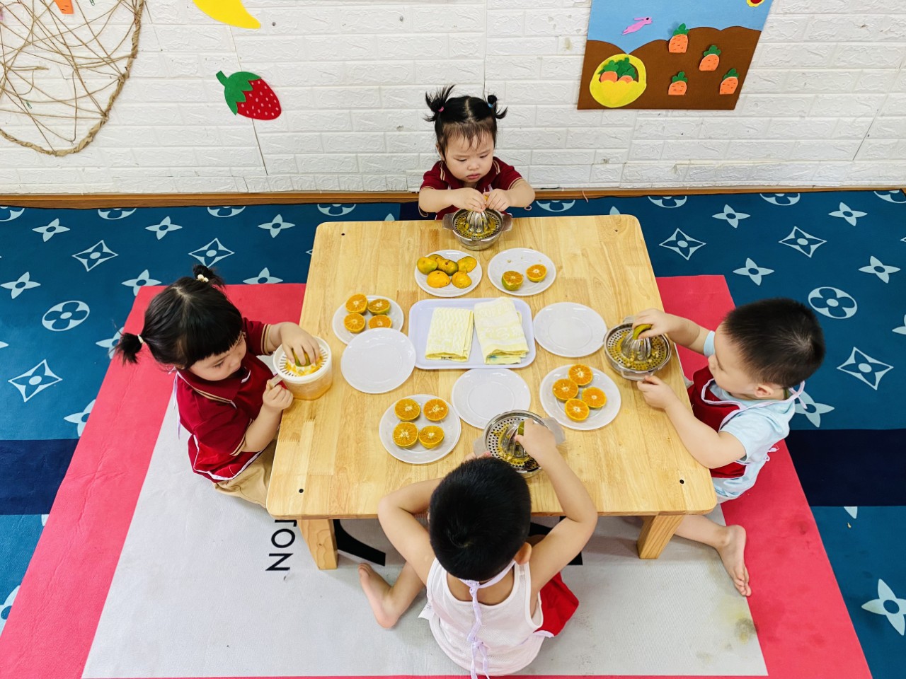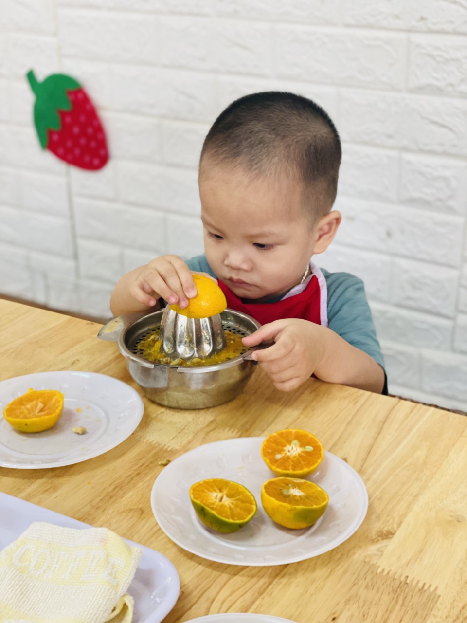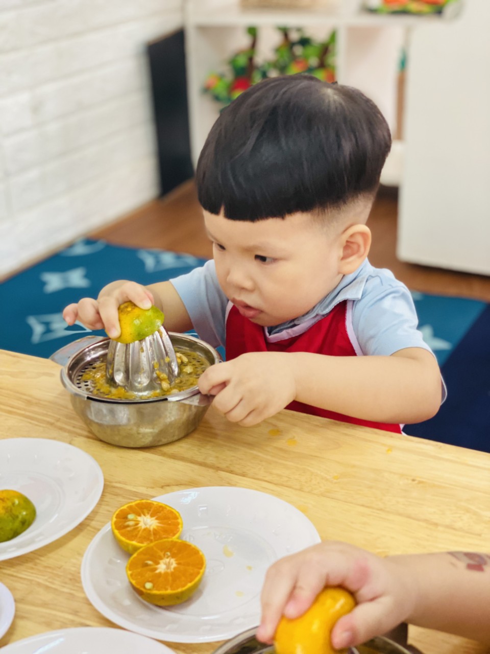 ✨Các bé được cô giáo hướng dẫn cụ thể từng kỹ năng cầm, xoay để vắt cam sao cho ra hết nước trong miếng cam và cùng thưởng thức cốc nước cam thơm ngon bổ dưỡng.