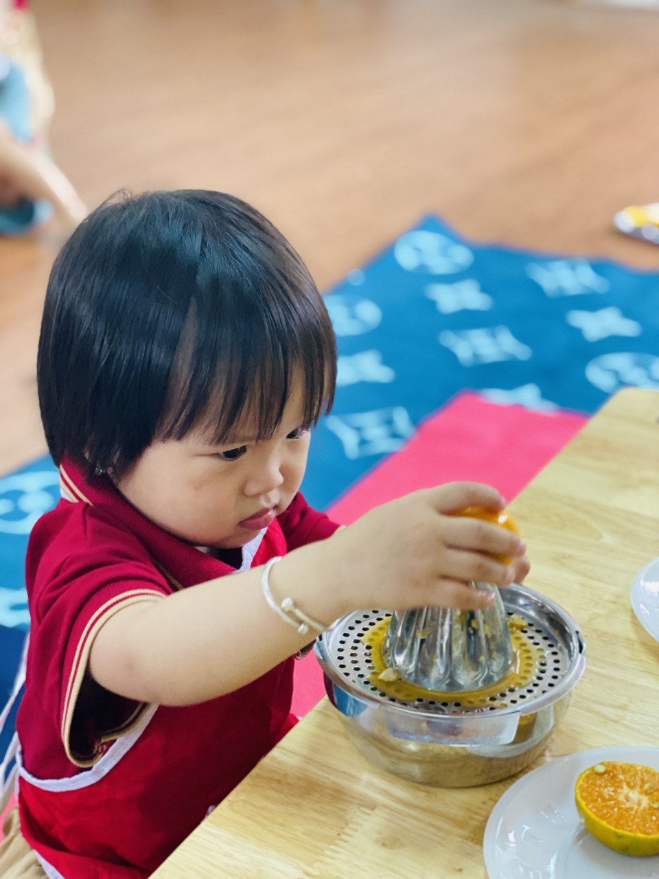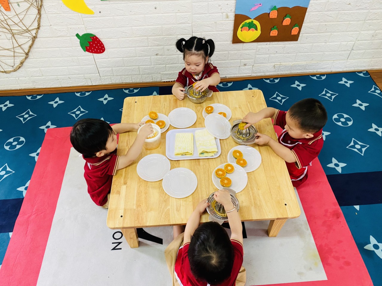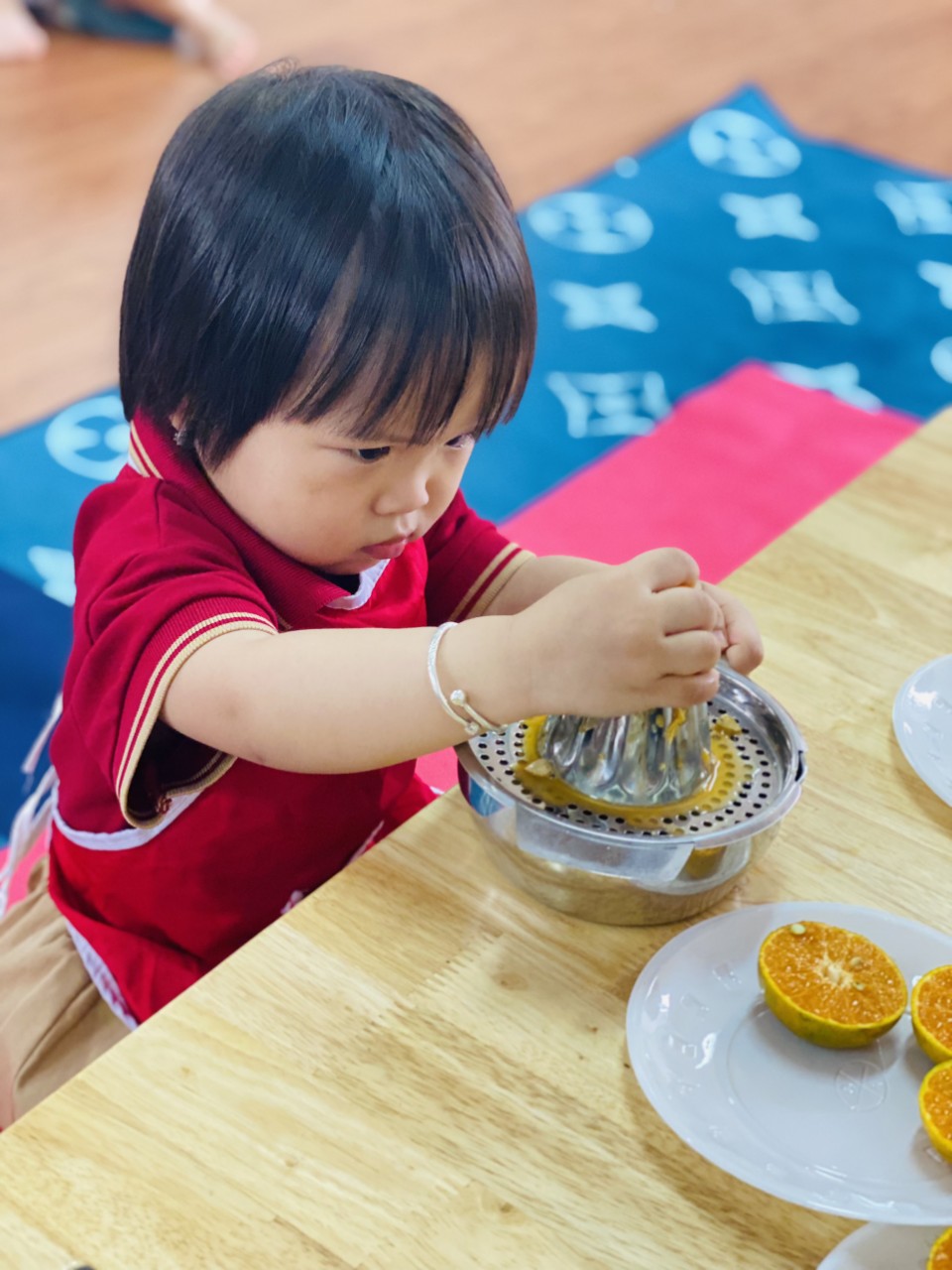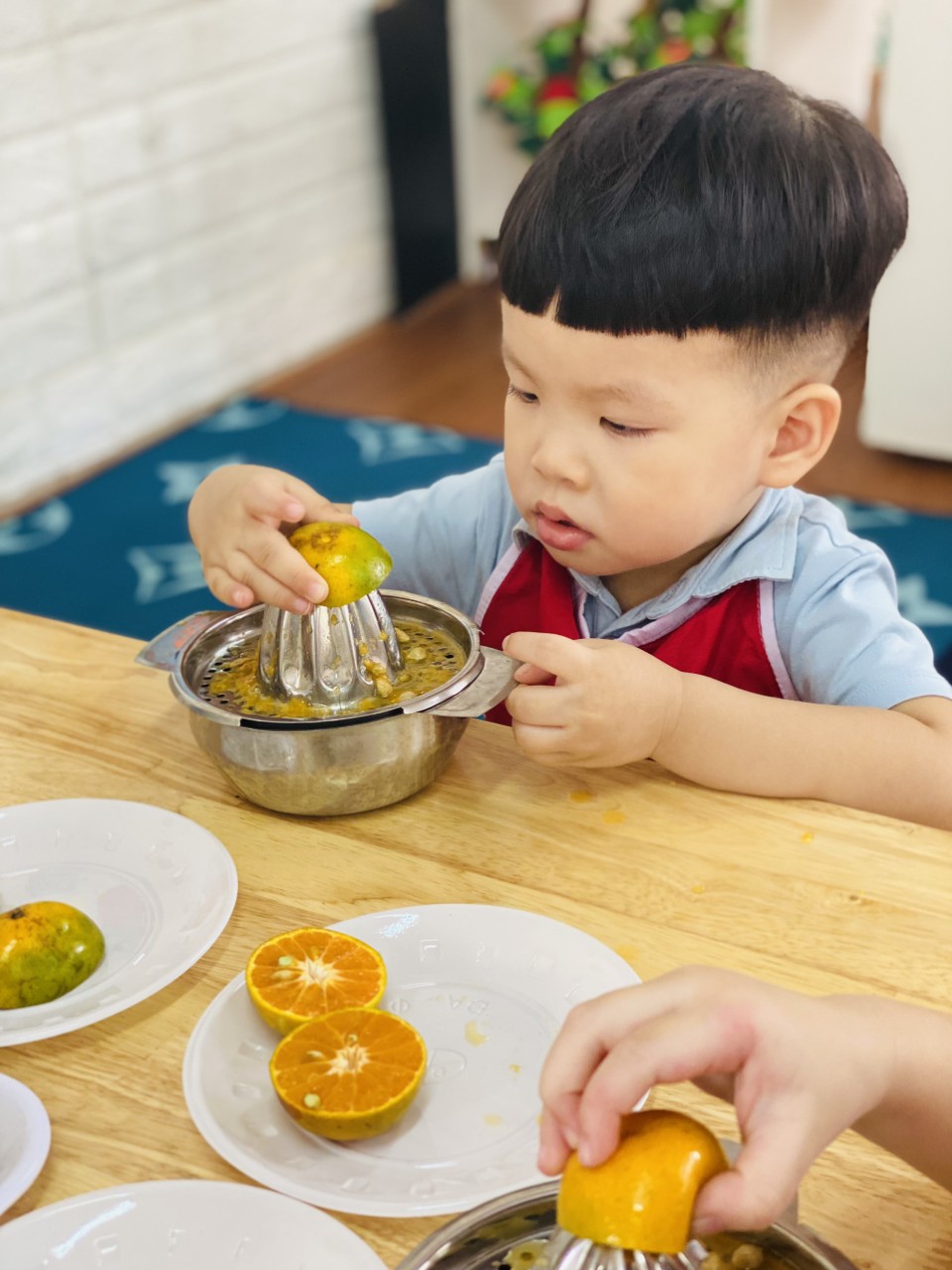 ✨Các bé được cô giáo hướng dẫn cụ thể từng kỹ năng cầm, xoay để vắt cam sao cho ra hết nước trong miếng cam và cùng thưởng thức cốc nước cam thơm ngon bổ dưỡng.