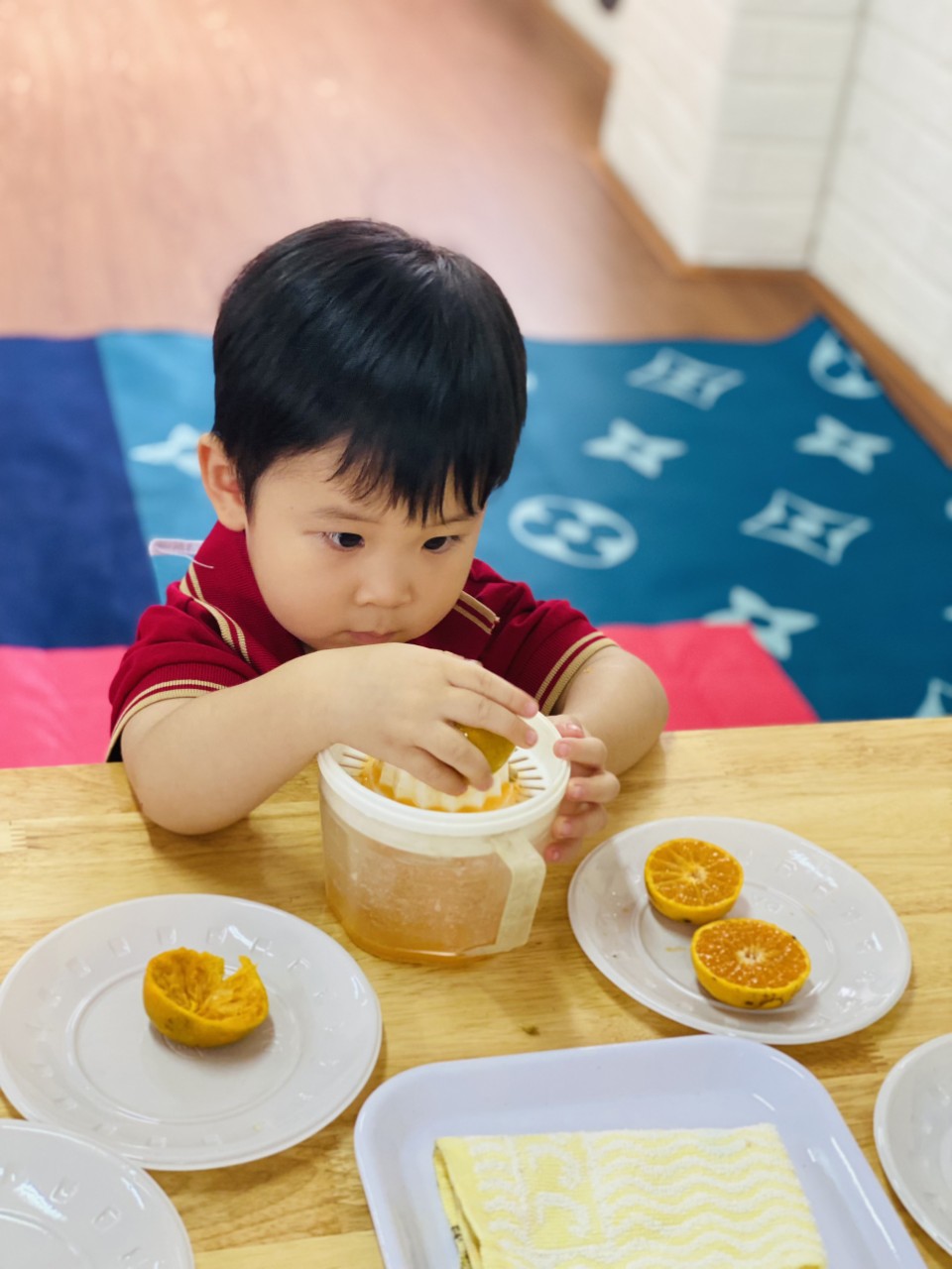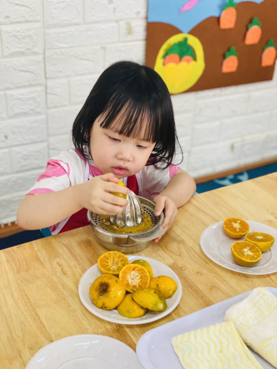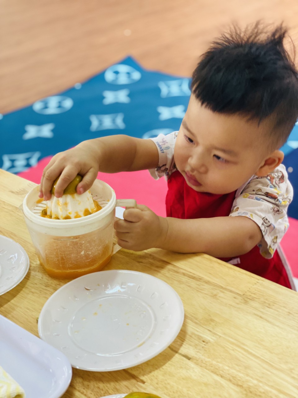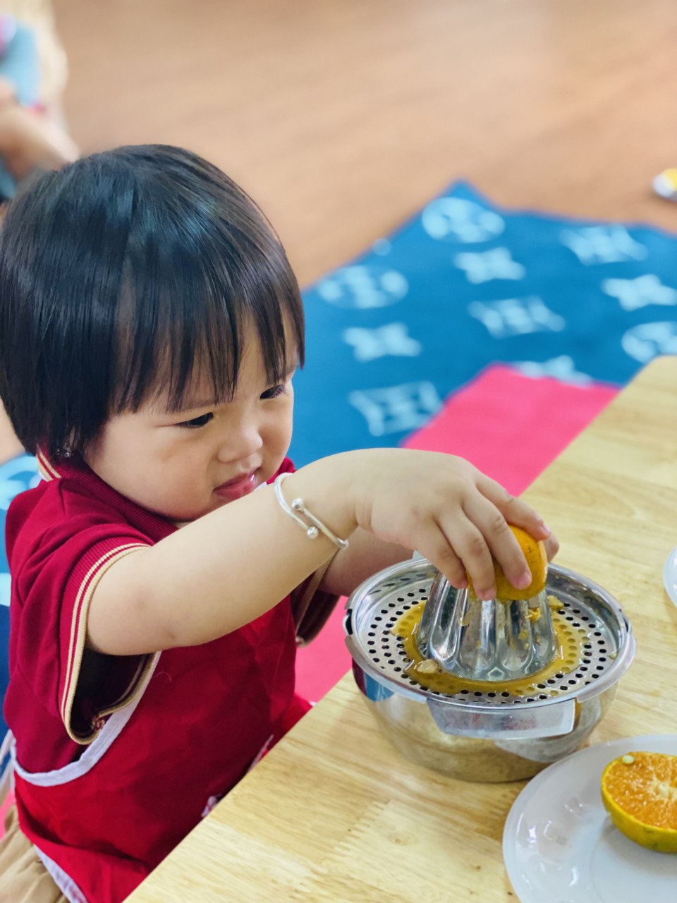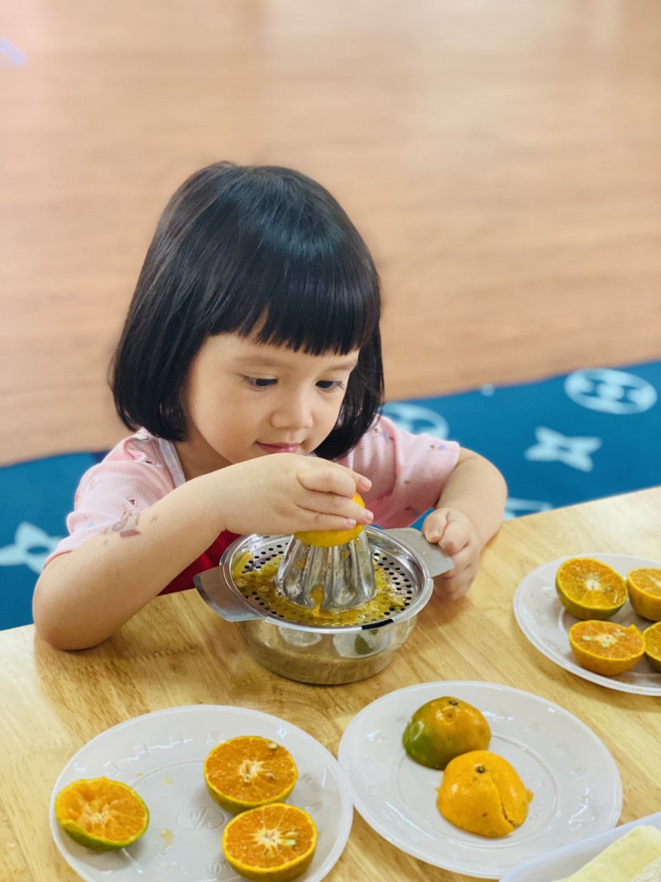 ✨Các bé được cô giáo hướng dẫn cụ thể từng kỹ năng cầm, xoay để vắt cam sao cho ra hết nước trong miếng cam và cùng thưởng thức cốc nước cam thơm ngon bổ dưỡng.