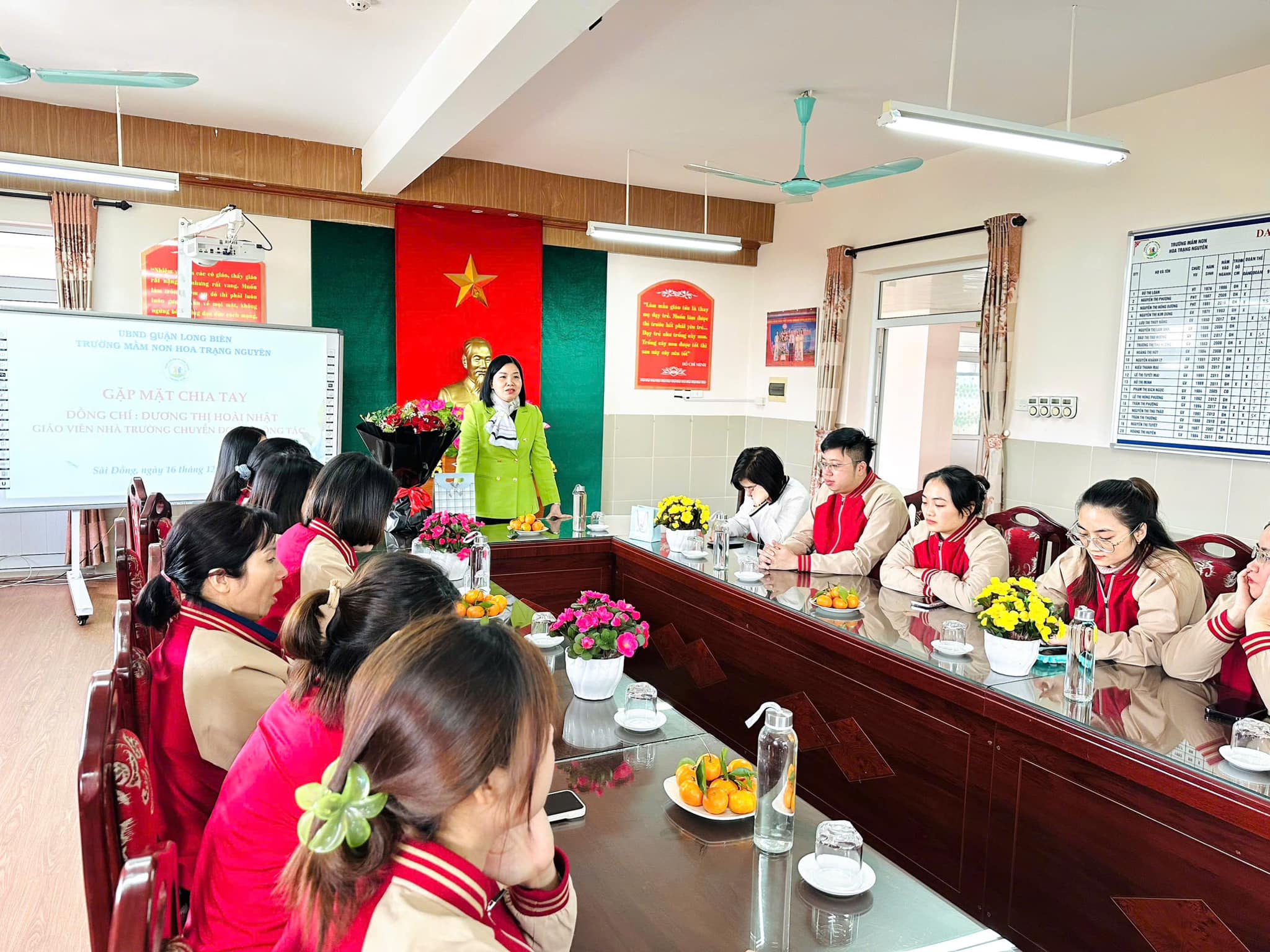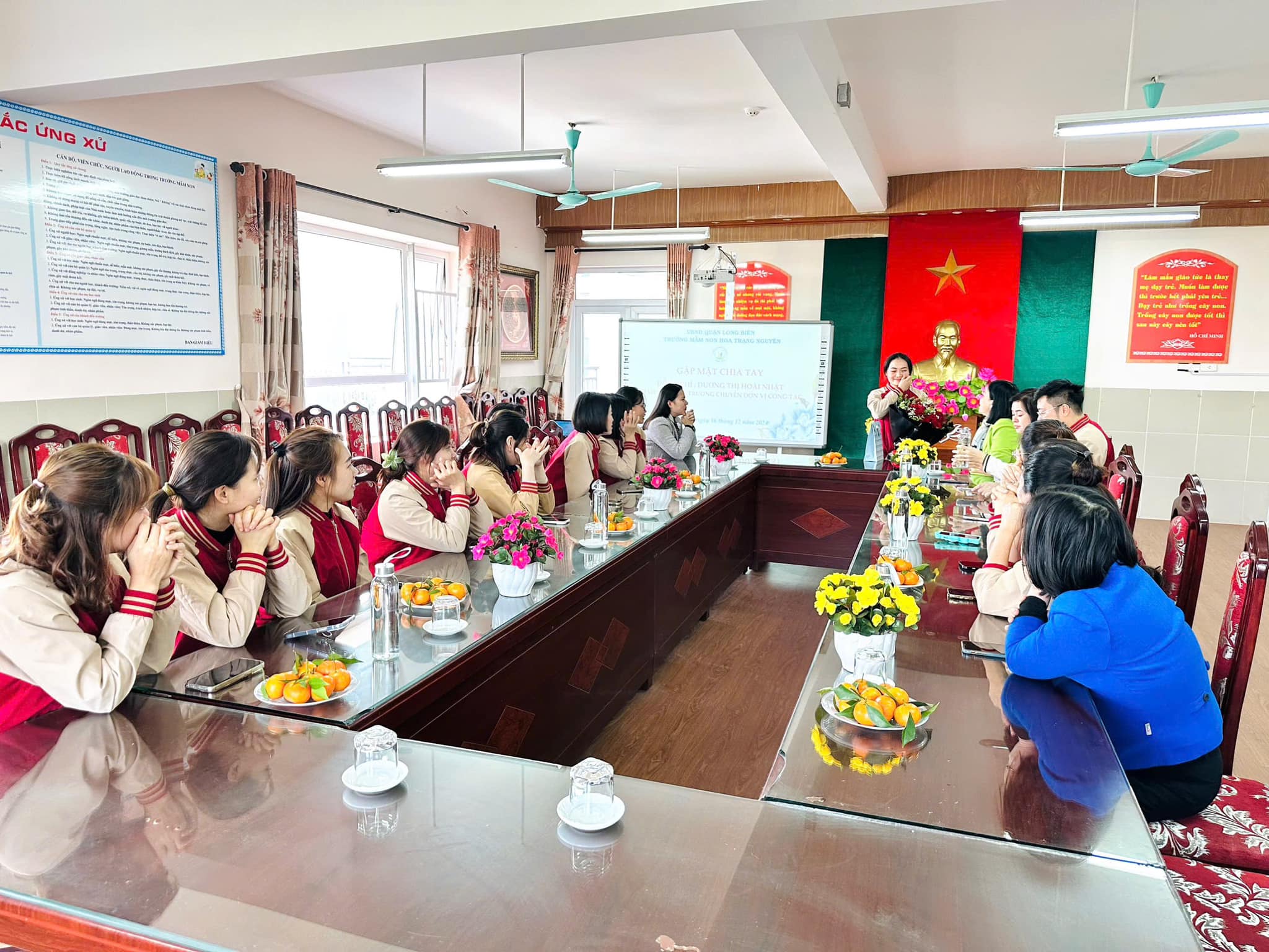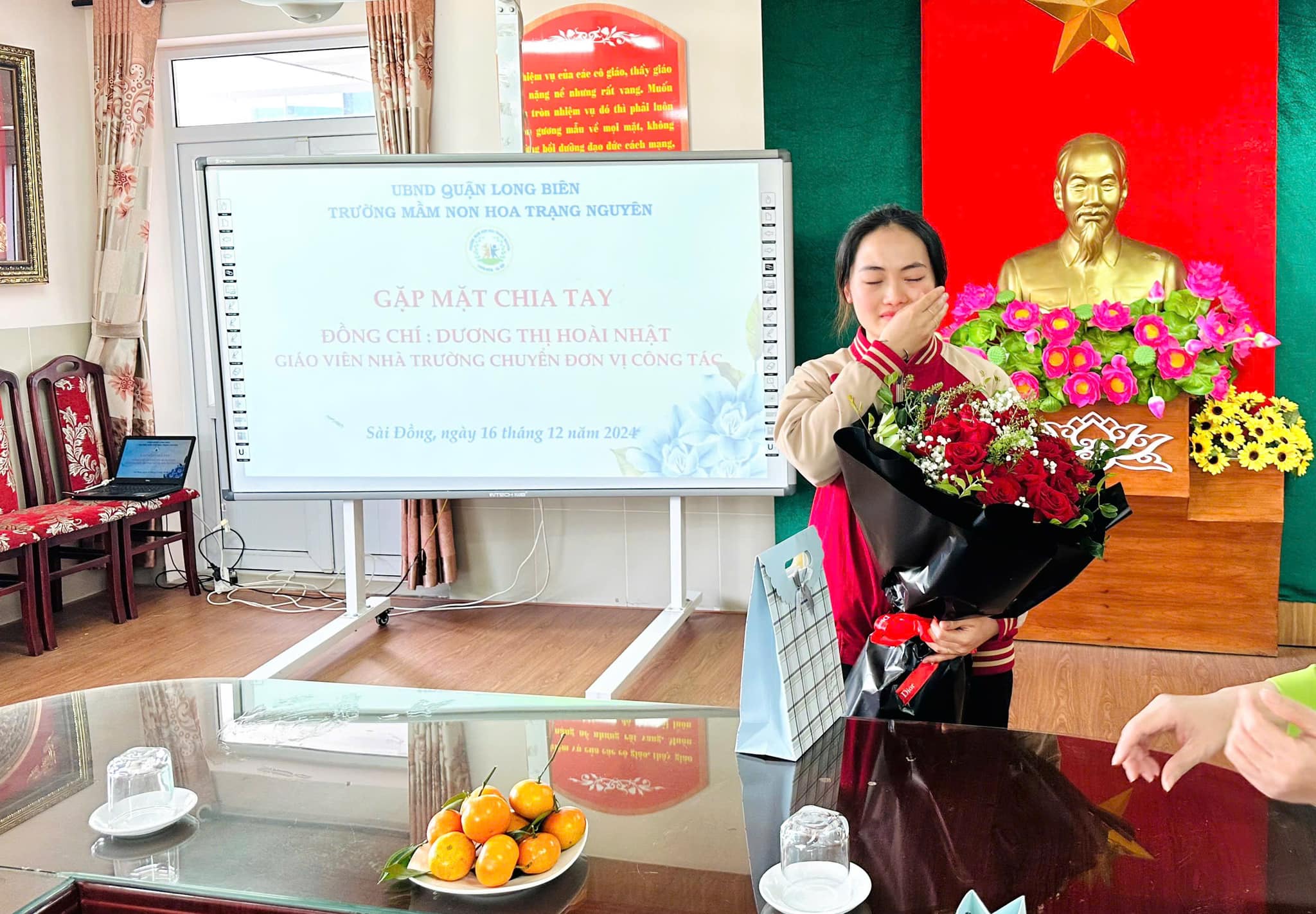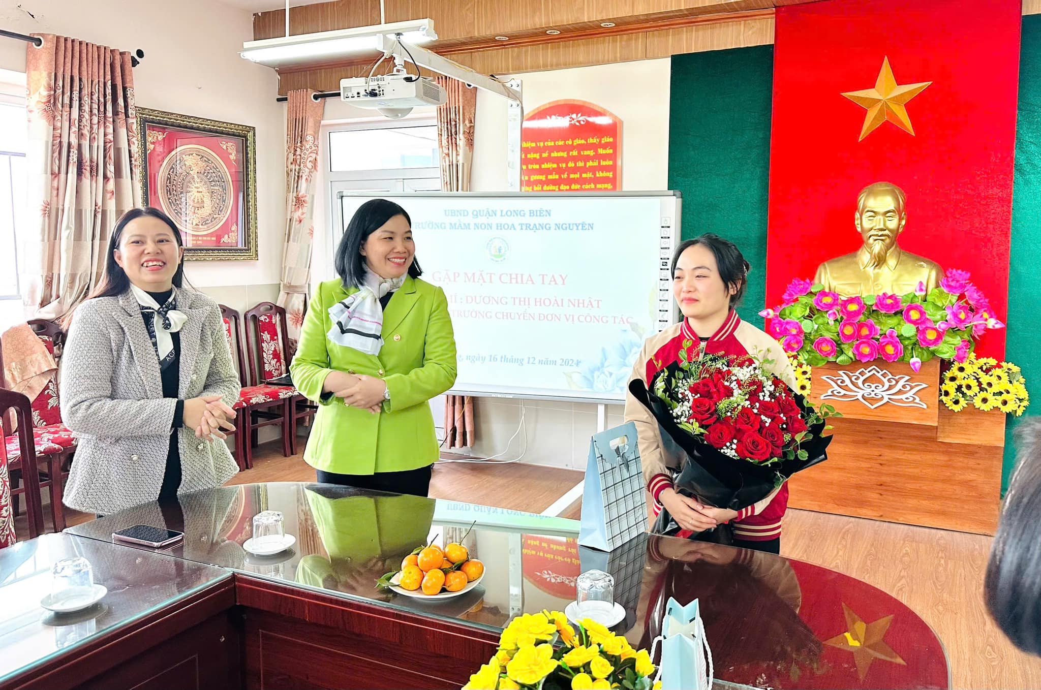 Trái ngược với tiết thời se lạnh của mùa Đông, tại phòng truyền thống nhà trường biết bao nhiêu lưu luyến, yêu thương, xúc động xen lẫn sự tự hào của CBGVNV. Với mong muốn tri ân và lưu giữ lại những kỷ niệm tốt đẹp nhất cùng những lời chúc chân tình của lần lượt các ban nghành đoàn thể: Nhà trường, Công đoàn, Chi đoàn, Ban giám hiệu... đối với đồng chí Nhật. Thân tặng đồng chí những bó hoa tươi thắm, những món quà giản dị mà tràn đầy ý nghĩa, nhắn gửi đồng chí sang đơn vị mới luôn nhớ mãi về ngôi trường Mầm non Hoa Trạng Nguyên thân yêu.