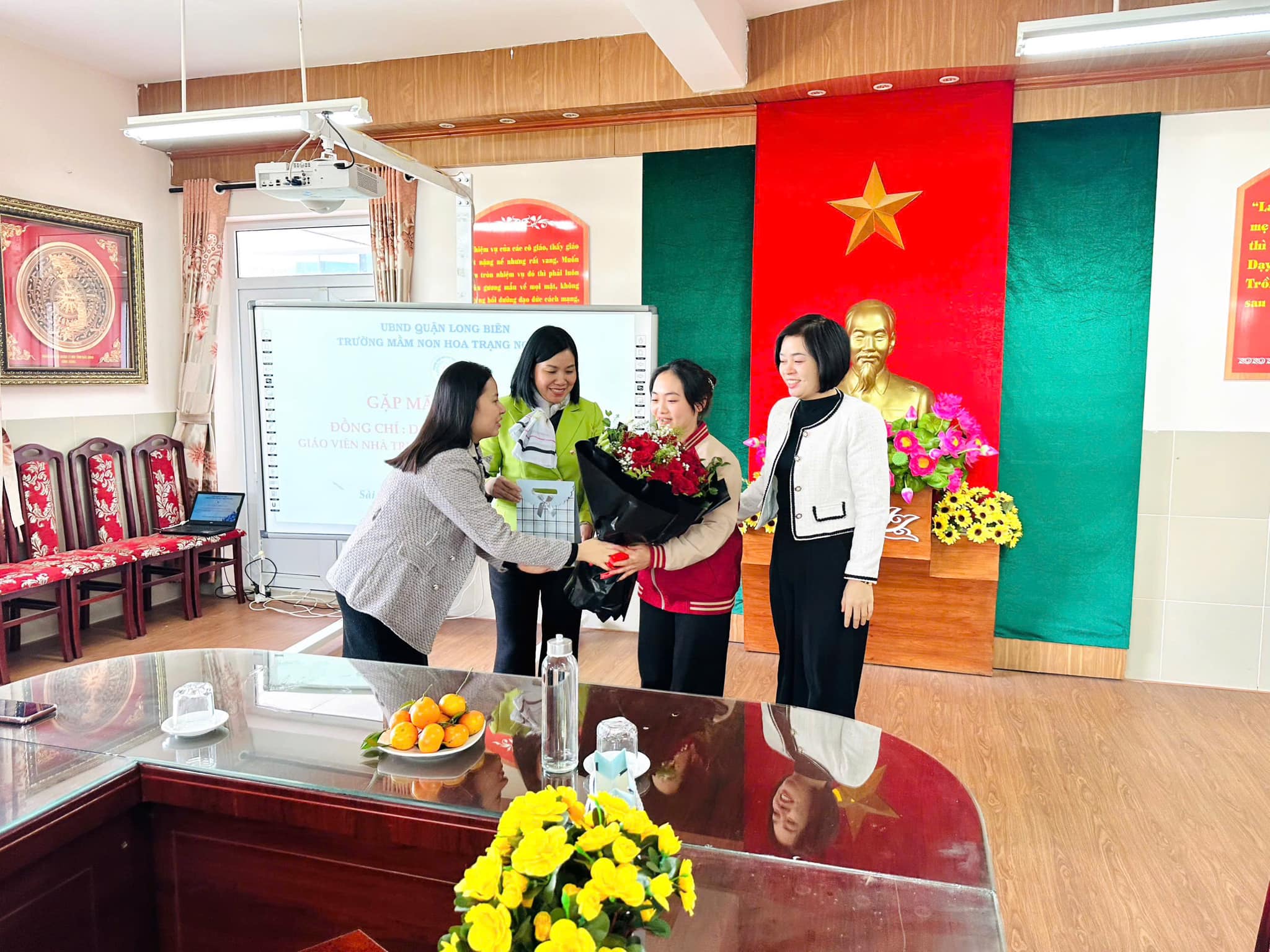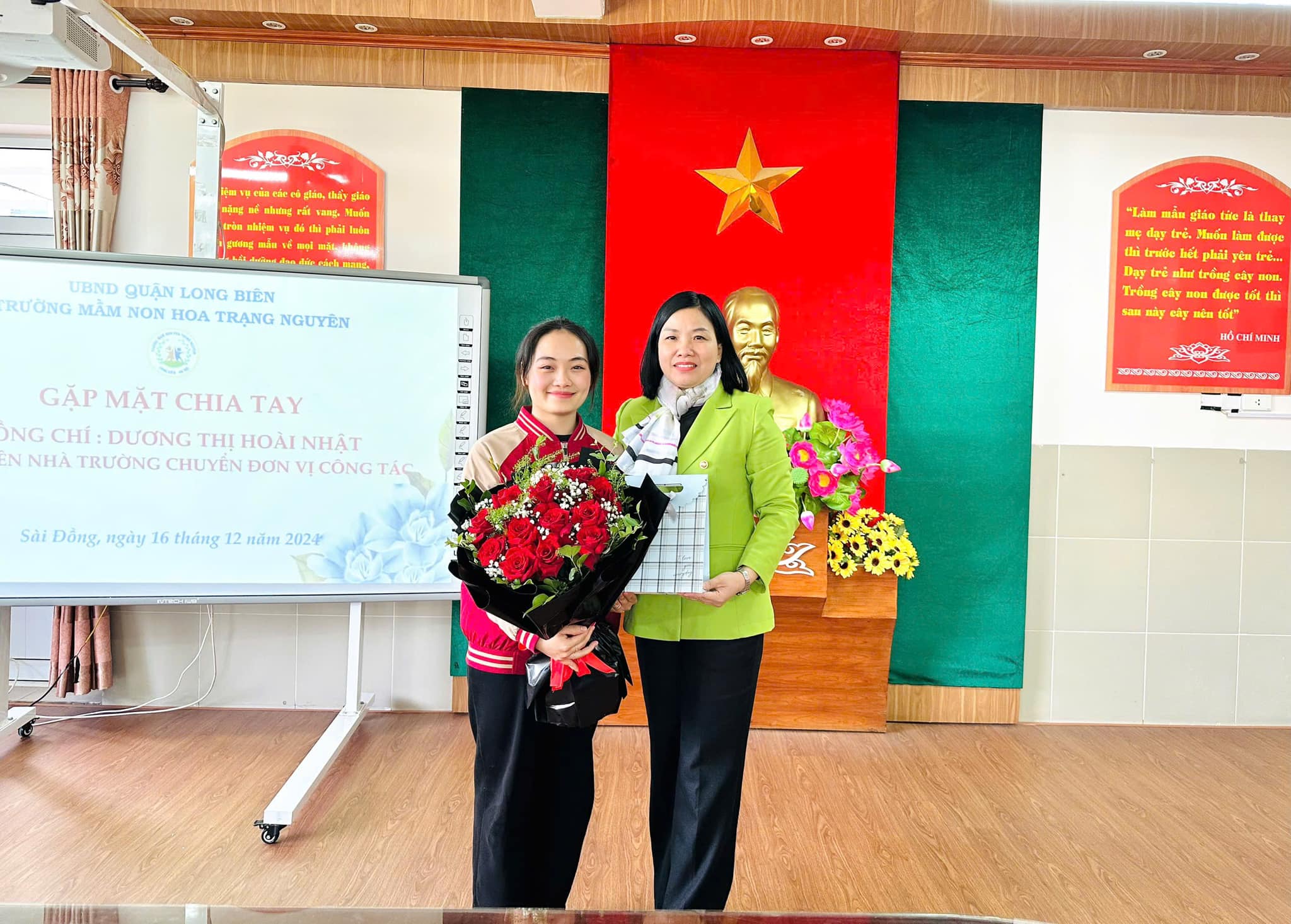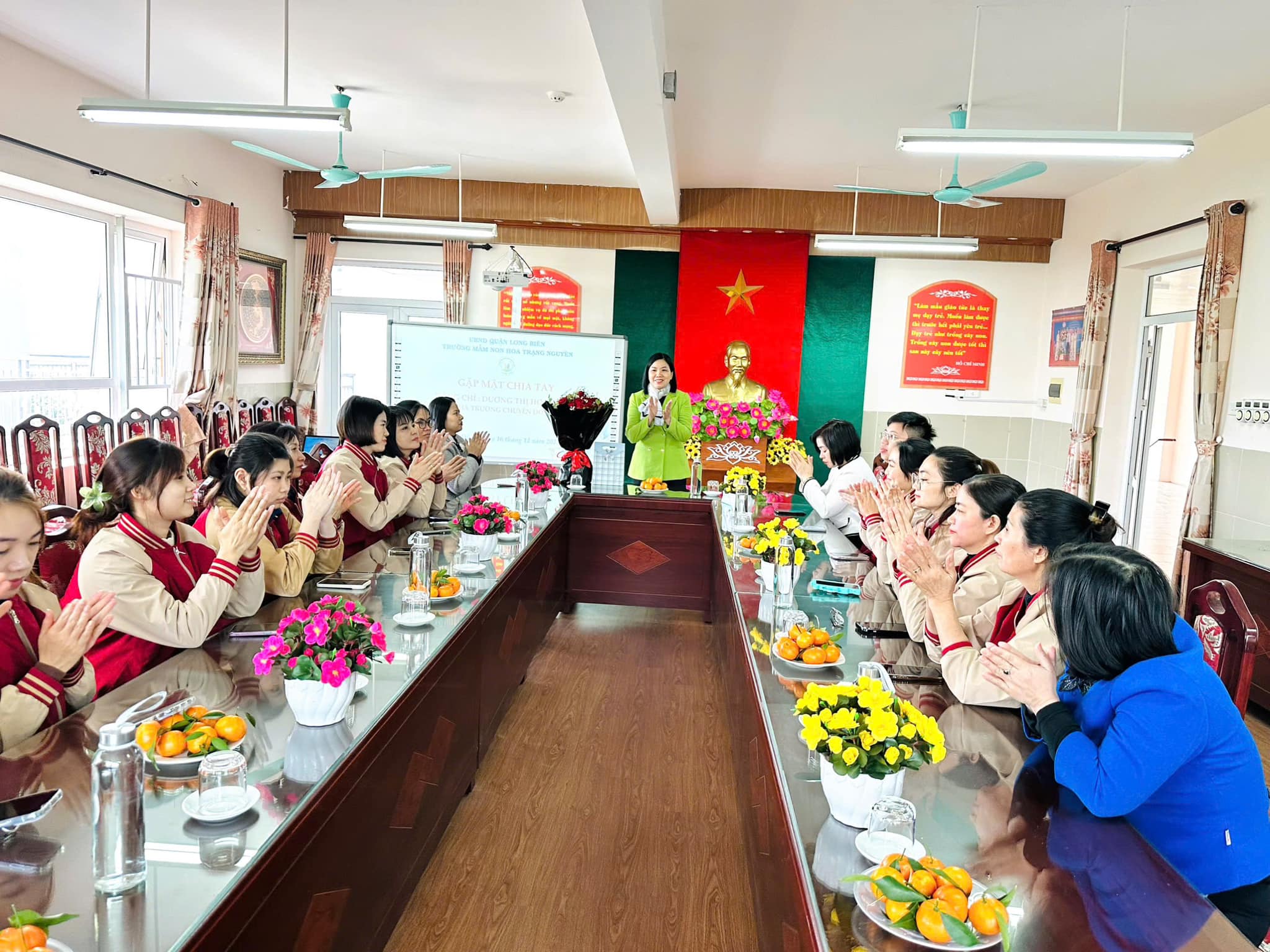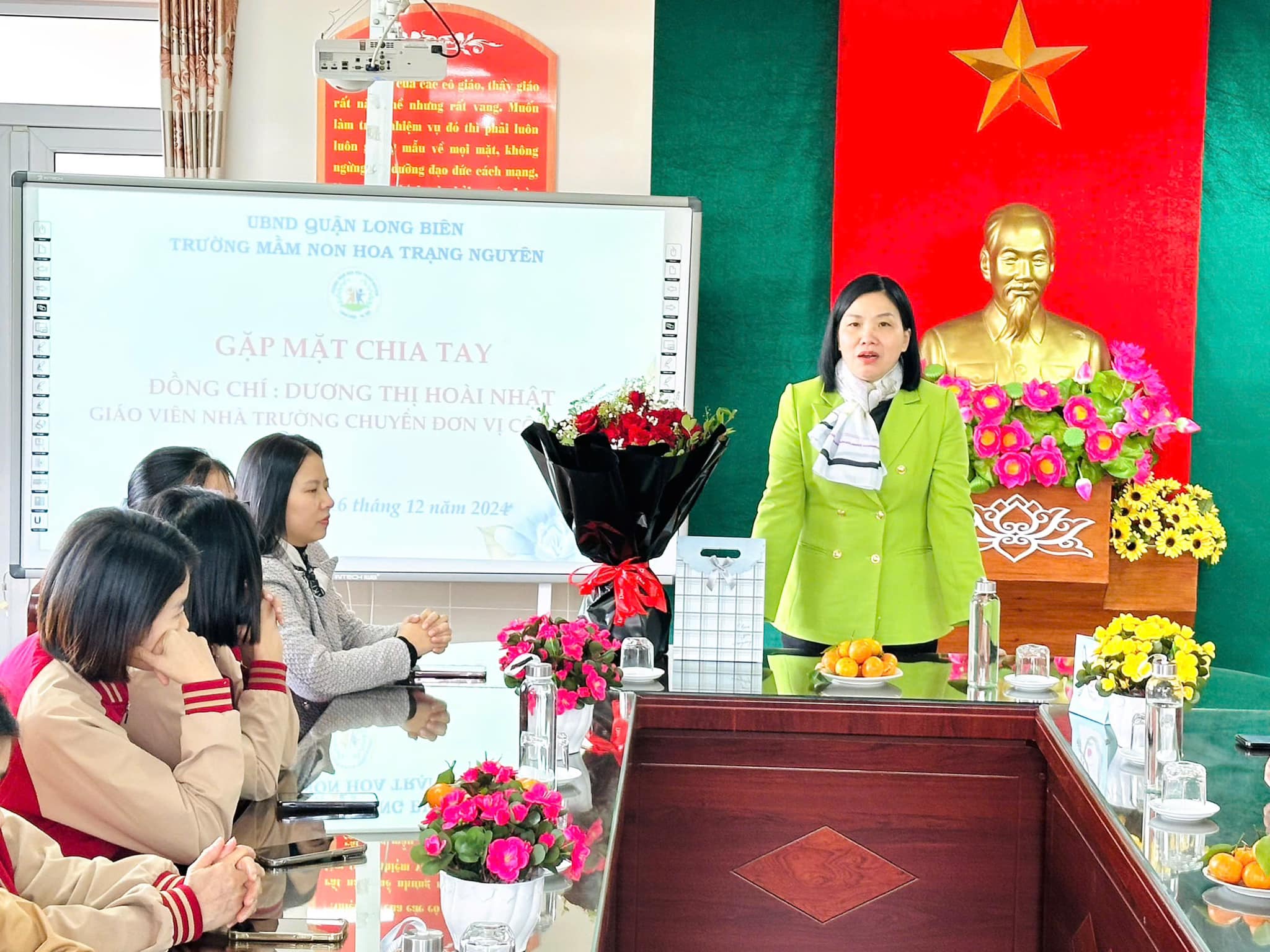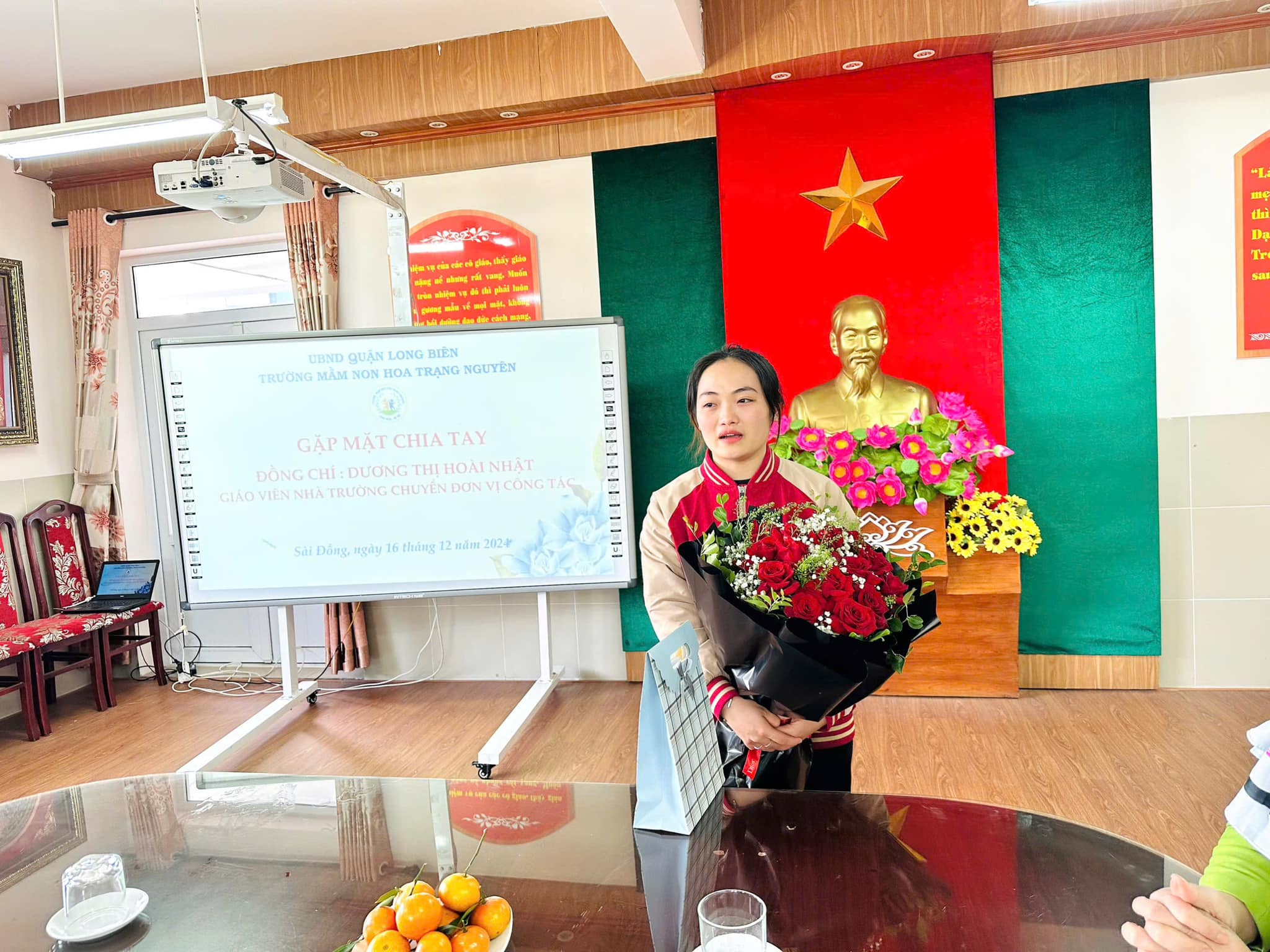 Trái ngược với tiết thời se lạnh của mùa Đông, tại phòng truyền thống nhà trường biết bao nhiêu lưu luyến, yêu thương, xúc động xen lẫn sự tự hào của CBGVNV. Với mong muốn tri ân và lưu giữ lại những kỷ niệm tốt đẹp nhất cùng những lời chúc chân tình của lần lượt các ban nghành đoàn thể: Nhà trường, Công đoàn, Chi đoàn, Ban giám hiệu... đối với đồng chí Nhật. Thân tặng đồng chí những bó hoa tươi thắm, những món quà giản dị mà tràn đầy ý nghĩa, nhắn gửi đồng chí sang đơn vị mới luôn nhớ mãi về ngôi trường Mầm non Hoa Trạng Nguyên thân yêu.
